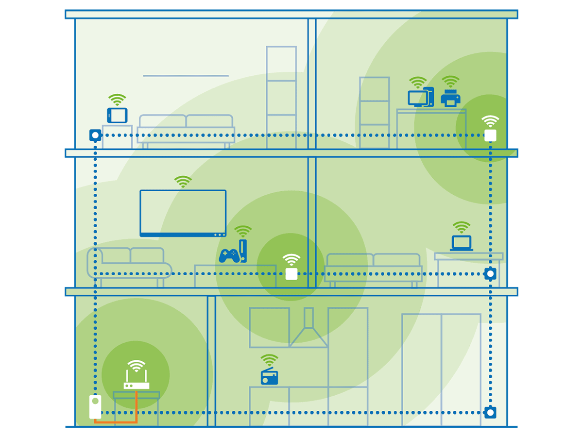 - Rete mesh intelligente: per una connessione stabile e capillare con velocità fino a 1200 Mbit/s tramite Powerline.